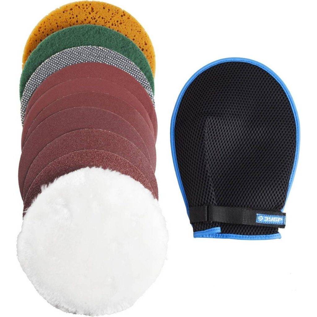 Набор Эксперт от отечественной компании Зубр используются для предварительного, промежуточного и финишного шлифования. С его помощью отделывают деревянные, металлические изделия, а также лакокрасочные, хромированные и никелированные плоскости. Главная особенность комплекта заключается в уникальной перчатке с анатомическим строением 10 насадками на липучке.
