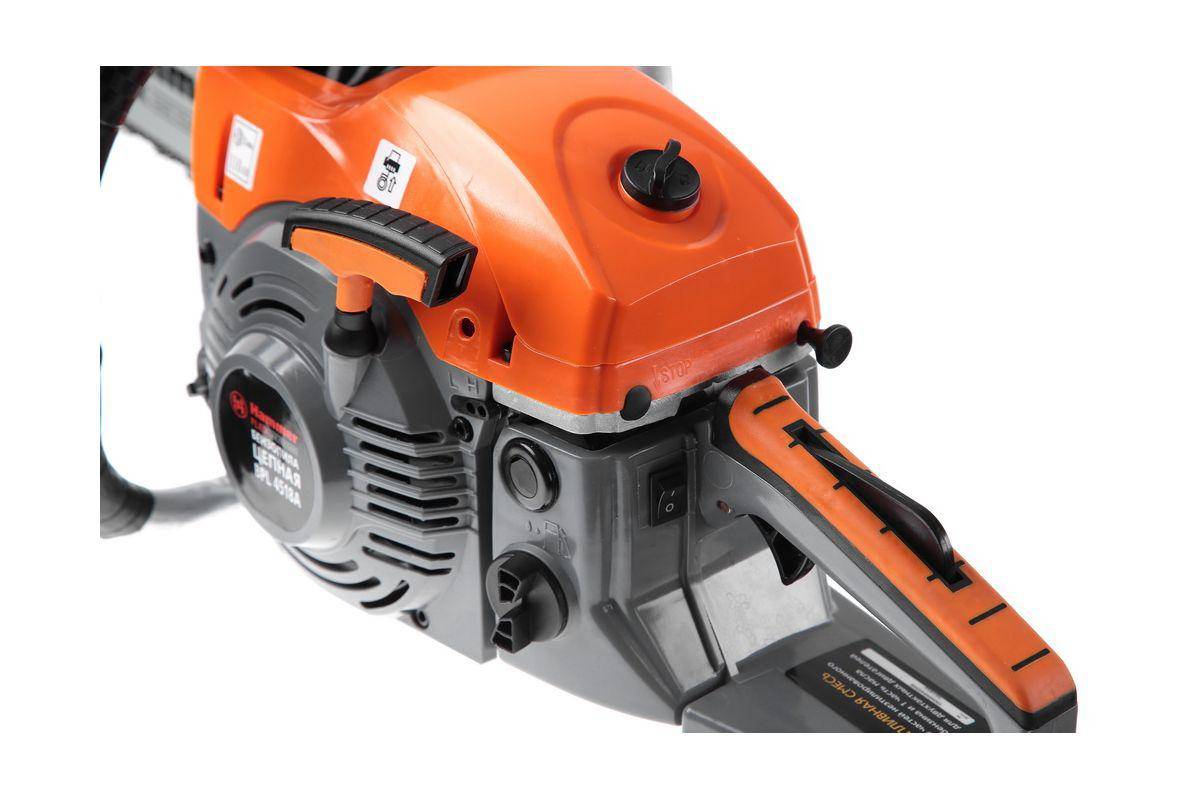 Это самая большая модель пилы “Хаммерфлекс”, она принадлежит к бытовому классу бензоинструмента. Ее вес составляет всего 3,8 кг. Мощность двухтактного бензинового мотора 1,4 л. с., охлаждение силовой установки воздушное. Запуск бензопилы производится ручным стартером. Подкачка топливной смеси в мембранный карбюратор осуществляется при помощи праймера.
