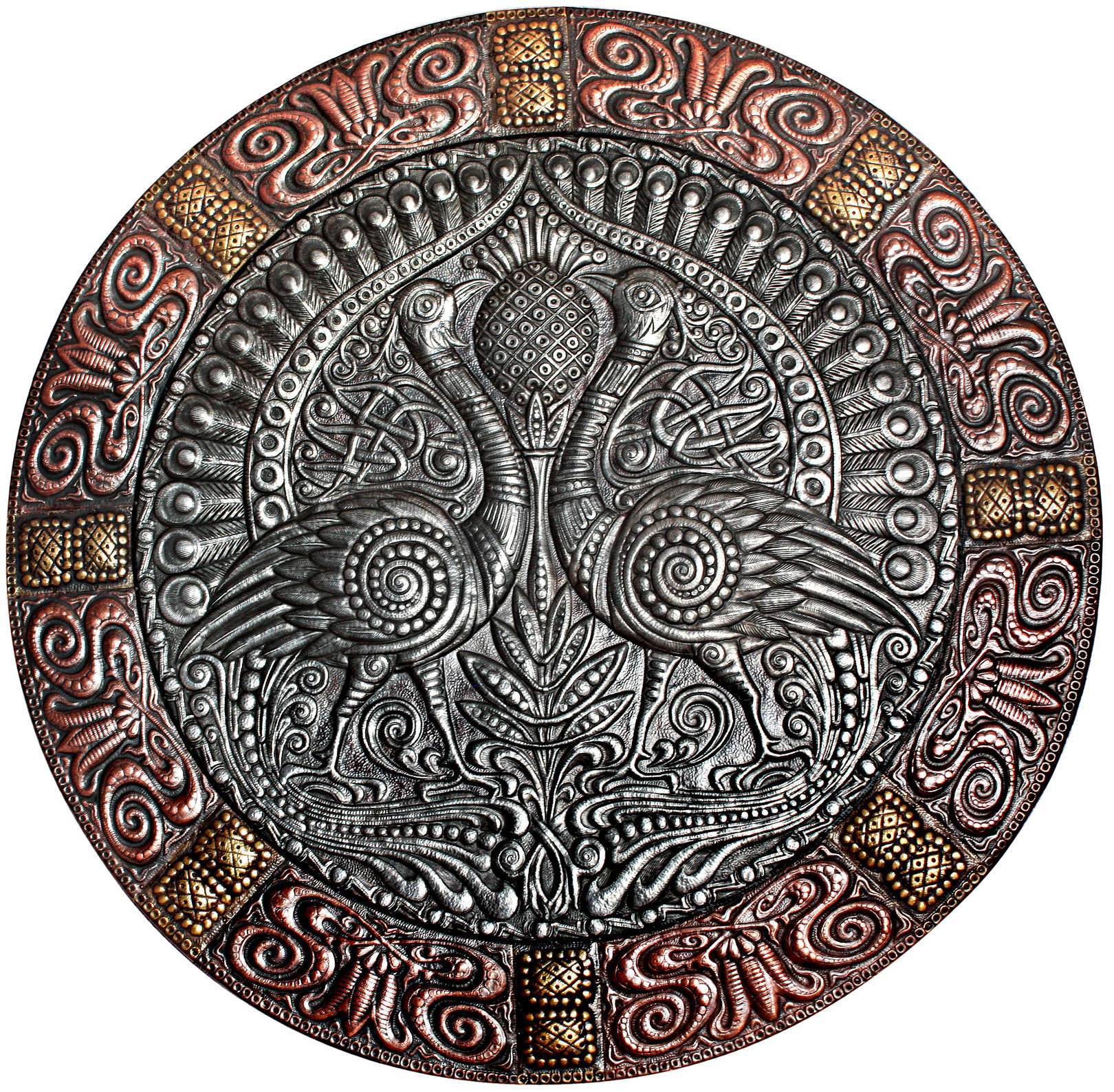 Павлины (панно-рондо) 2008 г. Алюминий, медь, латунь; чернение, холодная эмаль 90 х 90 см