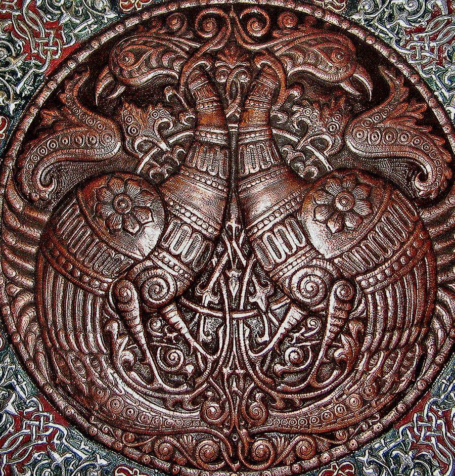 Следующий этап чеканки или тиснения по плотной фольге — раскраска. Есть несколько техник, доступных любителям. Самая простая – это выполнение тиснения закругленным кончиком мягкого карандаша. Графит будет заполнять углубления и давать визуальный эффект, похожий на чернение серебряных изделий. Другая техника-покрытие одних частей рисунка краской-серебрянкой из алюминиевой пудры, а других — бронзовой краской. Консистенция краски должна быть сколь возможно густая. Это ускорит высыхание и создаст дополнительный визуальный эффект.