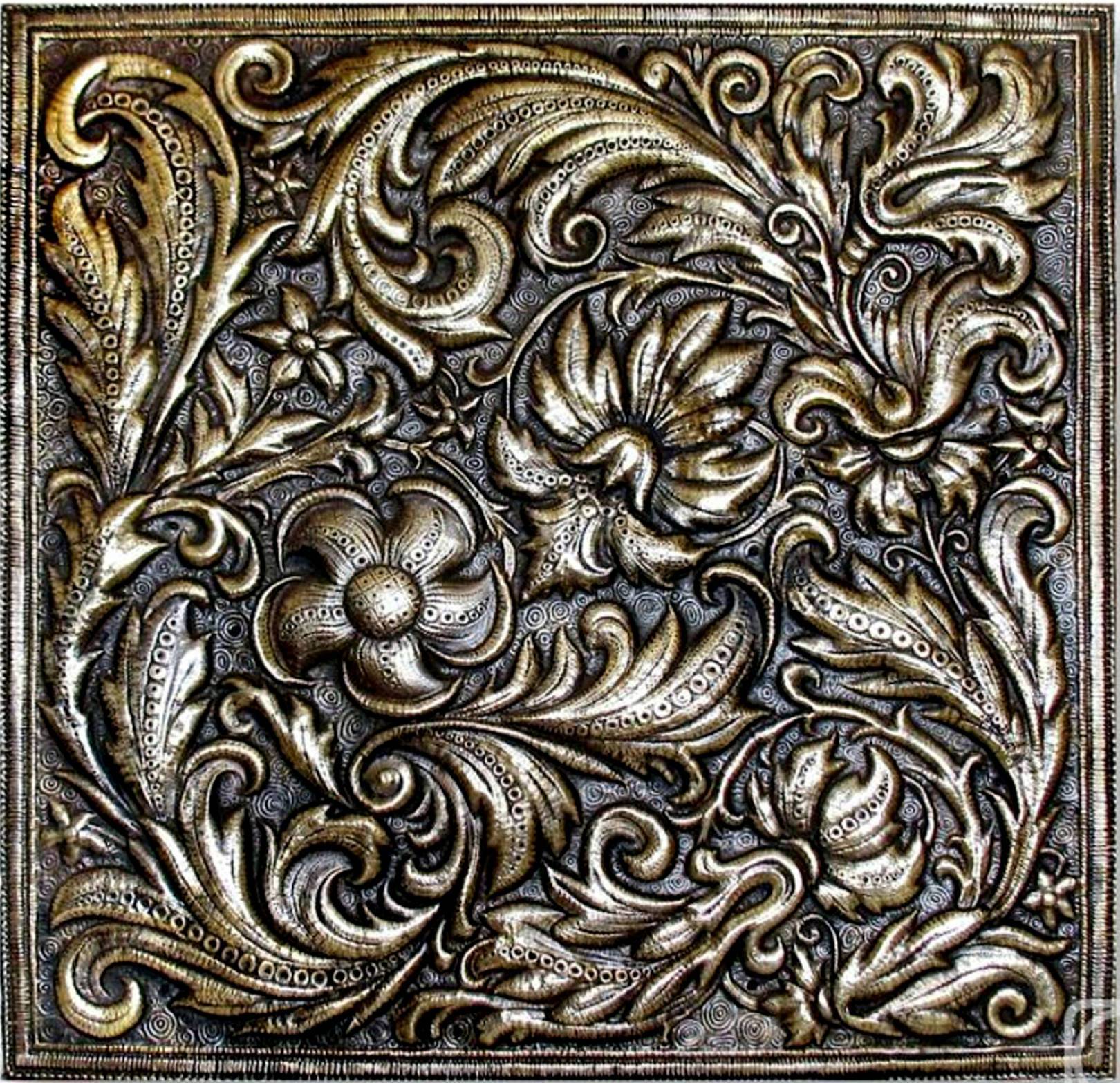 - Контурной, которая чеканится на листовом металле без заранее нанесенного рельефа. Визуально такая чеканка схожа с гравировкой, но отличается от нее выпуклыми или вогнутыми формами. Этот способ применяют для изготовления декоративных элементов интерьеров и для нанесения орнамента на плоские поверхности.