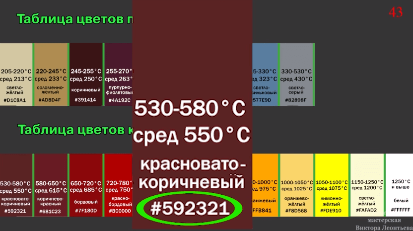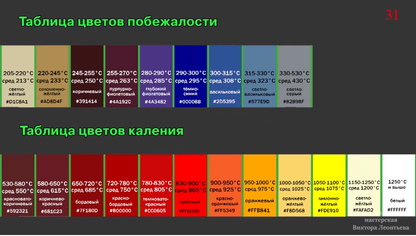 Часто на поверхности объекта проявляются сразу два смежных цвета. Не сложно догадаться, что температура этого объекта находится между средними значениями температур, указанными на обоих шаблонах. В сравнении с приборными измерениями, точность этого метода, конечно, меньшая. И все же, во многих случаях применения, например, при выполнении не особо ответственной закалки или отпуска, точности цветового метода вполне хватает. Что же касается обработки резанием, когда по цветам побежалости на движущейся стружке контролируется расстояние режущей кромки, причем, в разных ее точках, замены этому старому методу, пожалуй, не найти. Таблиц с цветами побежалости и каления в литературе и интернете опубликовано достаточно. Их интерпретации отличаются по форме и по содержанию, к сожалению, тоже. В отличие от большинства из них цвета, используемые в этом видео уроке шаблонов, выверены с помощью компьютера по реальным цветам каления и по цветам побежалости углеродистых сталей. Указанные на шаблонах названия цветовых оттенков условные. А их точная идентификация осуществима по указанному ниже так называемому цветовому коду html.