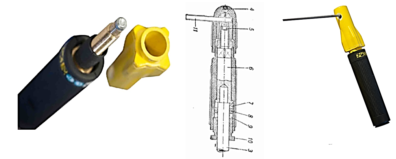 Этот держак для сварочного аппарата представляет собой самую популярную у профессиональных сварщиков модель электрододержателя. Он представляет собой конструкцию, состоящую из трех сваренных между собой стальных прутков, причем прутки сварены так, что средний выполняет роль пружины, прижимающей стержень к остальным двум. Такой фиксатор из-за своей простоты имеет низкую степень защиты, так как значительная часть его находится под напряжением.