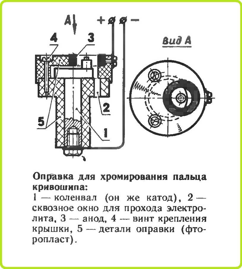 Для хромирования пальца кривошипа понадобится новая оправка. Как и при обработке колен вала, все открытые участки поверхности закрываются клеем «АГО». Анод вытачивается из стали с последующей заливкой свинцом и расточкой отверстия под палец. Применение стальной детали объясняется необходимостью обеспечить надежный контакт — в свинце резьбовые соединения ненадежные. Расчеты токов аналогичны. Работа проводится в оправке вала с помощью специальной насадки.