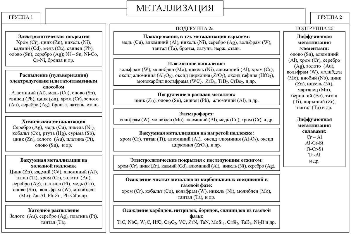 Разновидности металлизации по способу взаимодействия металлизируемой поверхности с наносимым металлом (нажмите для увеличения)