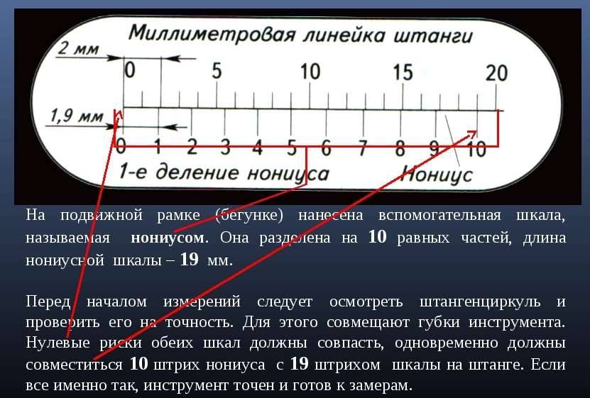На подвижных губках нанесена вспомогательная шкала, называемая нониусом (рис. слева). Она разделена на 10 равных частей, а вся длина нониусной шкалы составляет 19 мм. Значит, длина каждой части равна 1,9 мм. Эта величина является ценой деления нониуса.