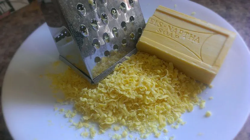 - Наберите в емкость воды и натрите в нее брусок хозяйственного мыла, а затем добавьте 150 мл столового уксуса.
