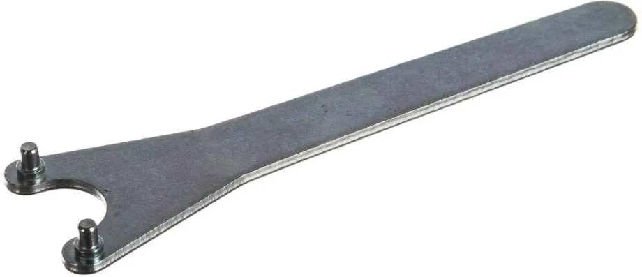 Диск на болгарке прижимается к посадочному месту фланцевой гайкой круглой формы. На ней вдоль краев имеются 2 или 4 отверстия под специальный рожковый ключ, который входит в общую комплектацию инструмента. У приспособления на рабочей площадке с полукруглой выемкой закреплены 2 небольших рожка. Их поперечное сечение немного меньшего диаметра, чем отверстия у гайки.