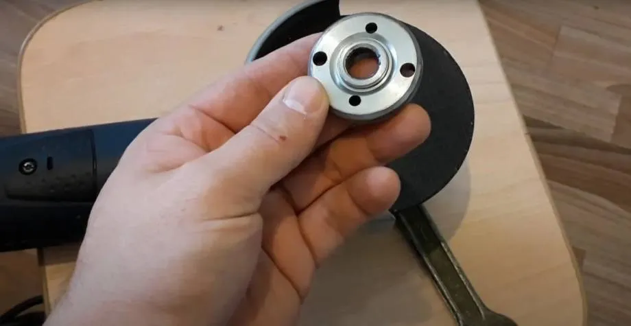 После подготовки ключ помещается в пространство под диск, а головка надевается на фланец УШМ и поворачивается в противоположном вращению круга направлении. После этого его можно с легкостью снять и поставить новый.