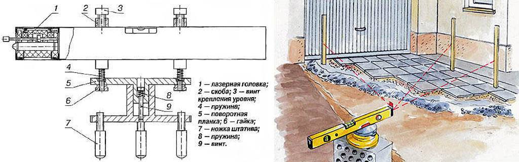 Если имеется готовый штатив от фотоаппарата или микрофона, то это намного упростит процесс изготовления. Если штатива нет, то его можно изготовить из реек. Для этого делается тринога, от которой отходит в центральной части брус толщиной 25х25 мм. В верхней части бруса закрепляется водный уровень, на котором фиксируется лазерная указка. На этом процесс изготовления закончен.