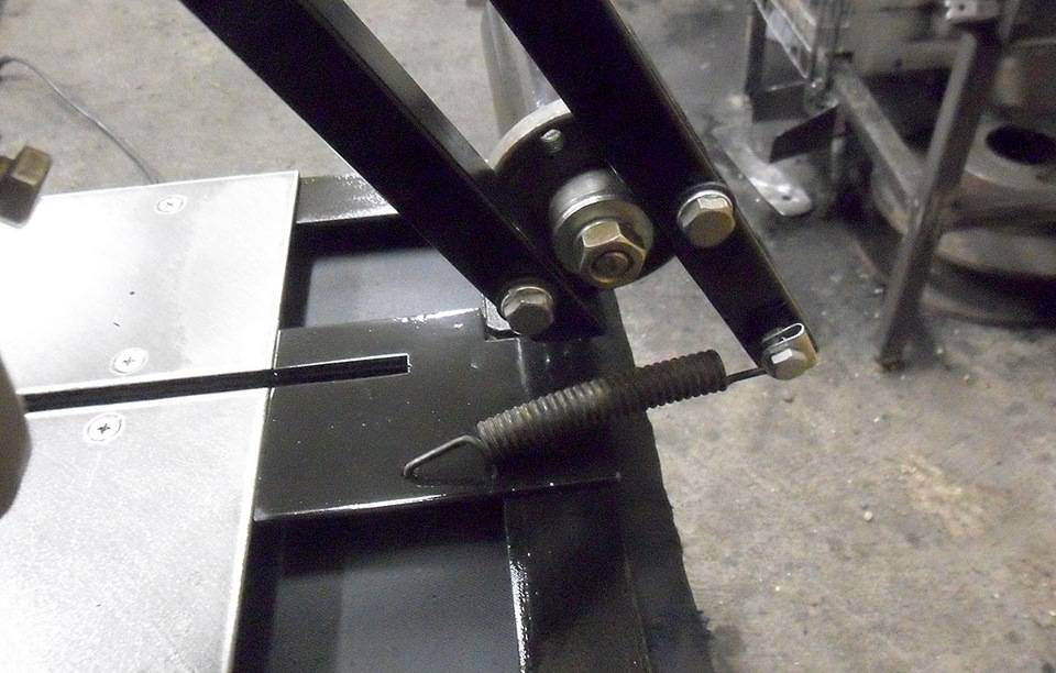 Безопасность использования станины во многом зависит от противовеса. Самым практичным считается тот вариант, когда в момент опускания инструмента он будет автоматически переходить в вертикальное положение, прекратив тем самым любые режущие манипуляции. Это будет не только очень удобно, но и безопасно. Самым простым способом считается установка пружинного механизма, который должен быть подобран в соответствии с характеристиками болгарки. Сама конструкция будет компактной и эффективной.