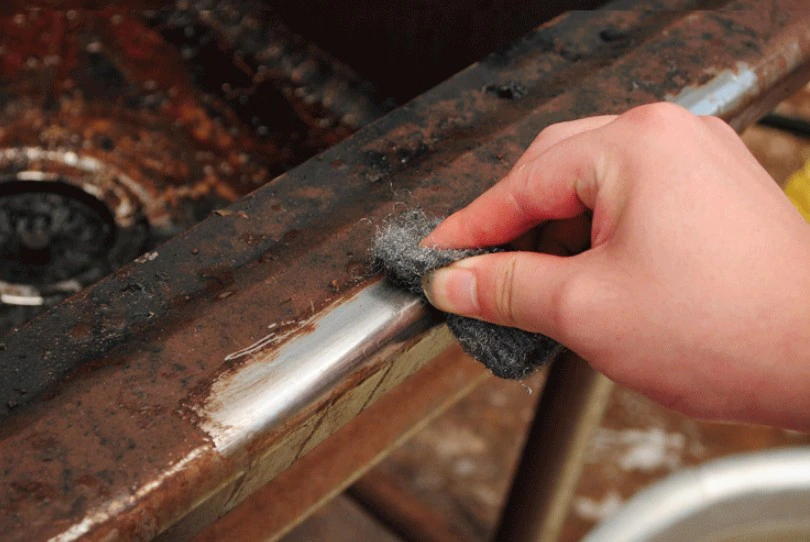 - Очистить предмет от загрязнений и отслаивающейся ржавчины, используя щётку по металлу или наждачную бумагу.