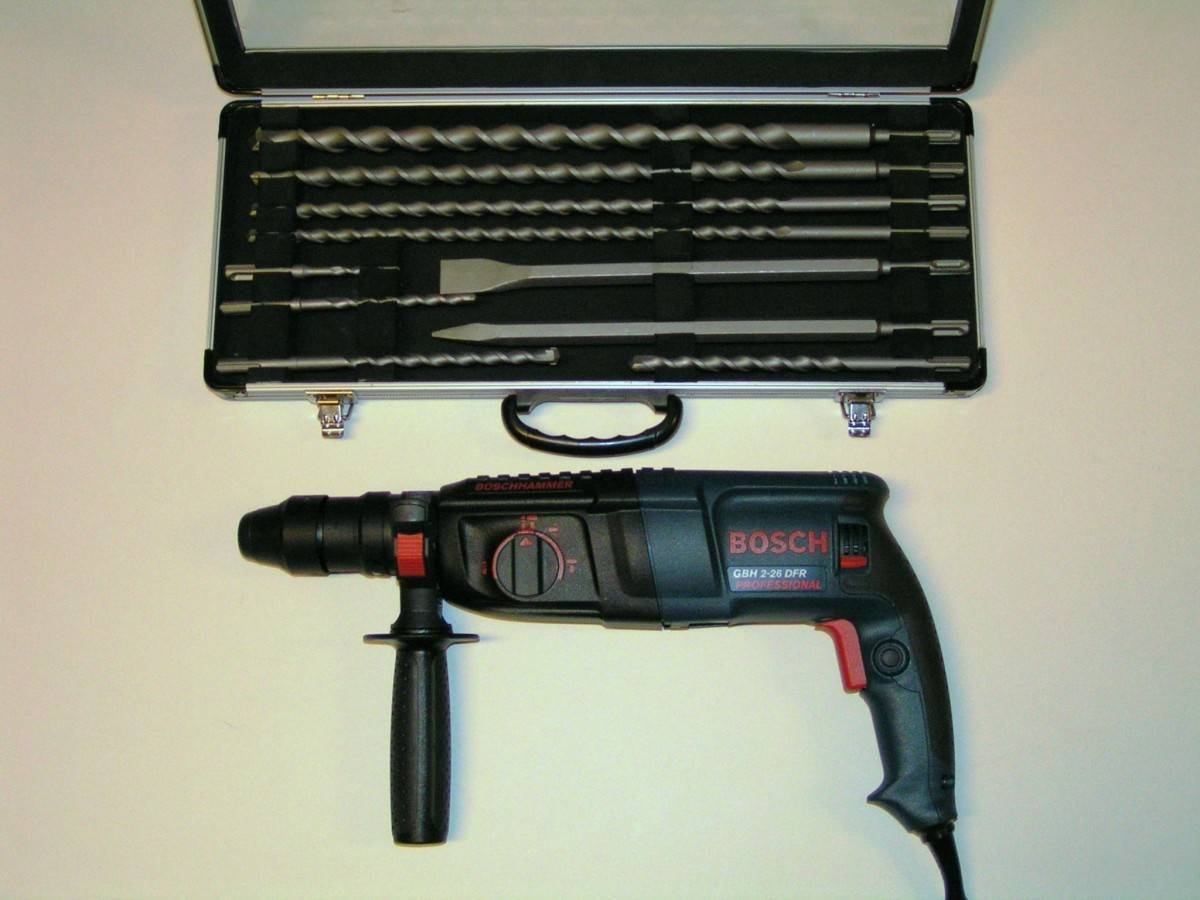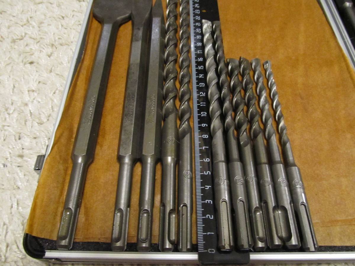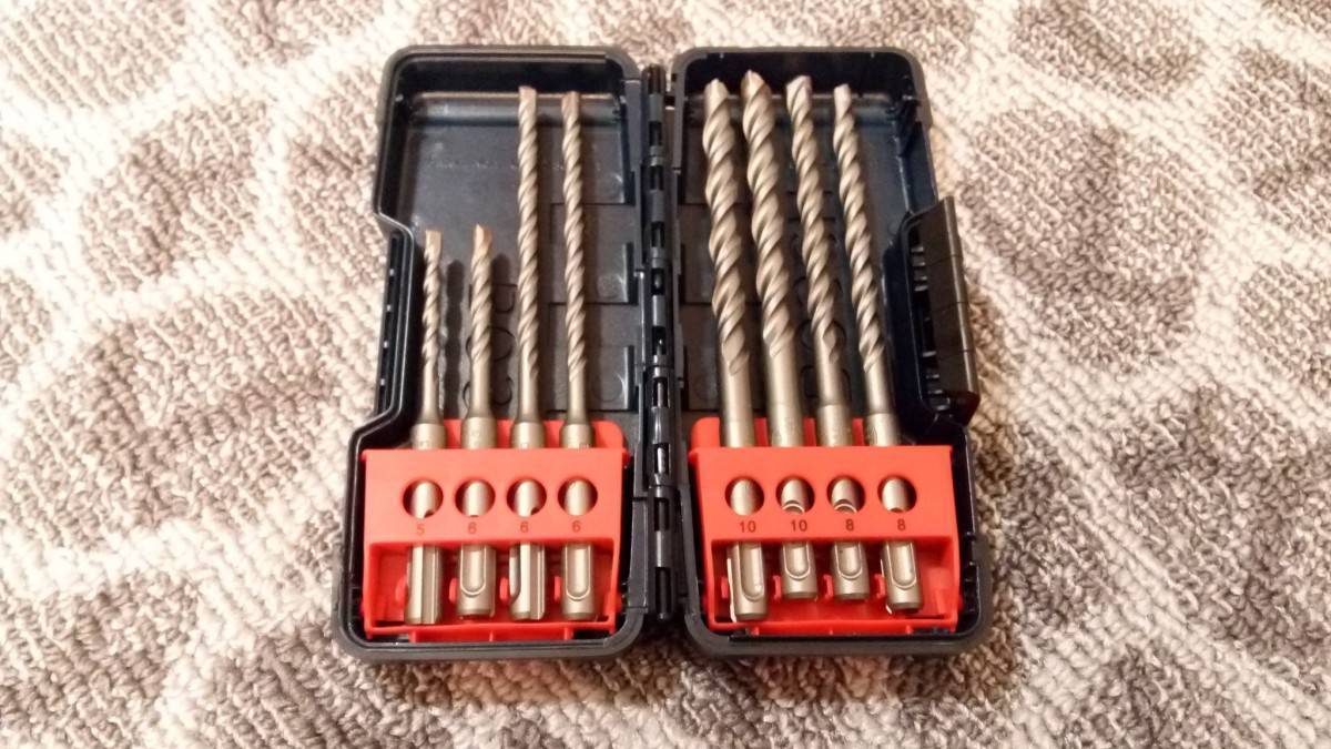 Набор буров и зубил в твёрдом пластиковом чемоданчике. В комплект ценой около 1500 рублей входят 13 предметов: 9 буров диаметром от 6 до 14 мм с длиной рабочей части от 160 до 260 мм, пика длиной 250 мм, два зубила на 20 и на 40 мм (каждое 250 мм длиной) и канальное зубило 22 на 250 мм. Тип хвостовика — SDS-plus диаметром 10 мм. Недорогой для такой богатой комплектации набор, произведённый в Германии, от известного производителя. Выбор домашнего мастера, который не только вешает полочки, но и, скажем, самостоятельно прокладывает проводку..