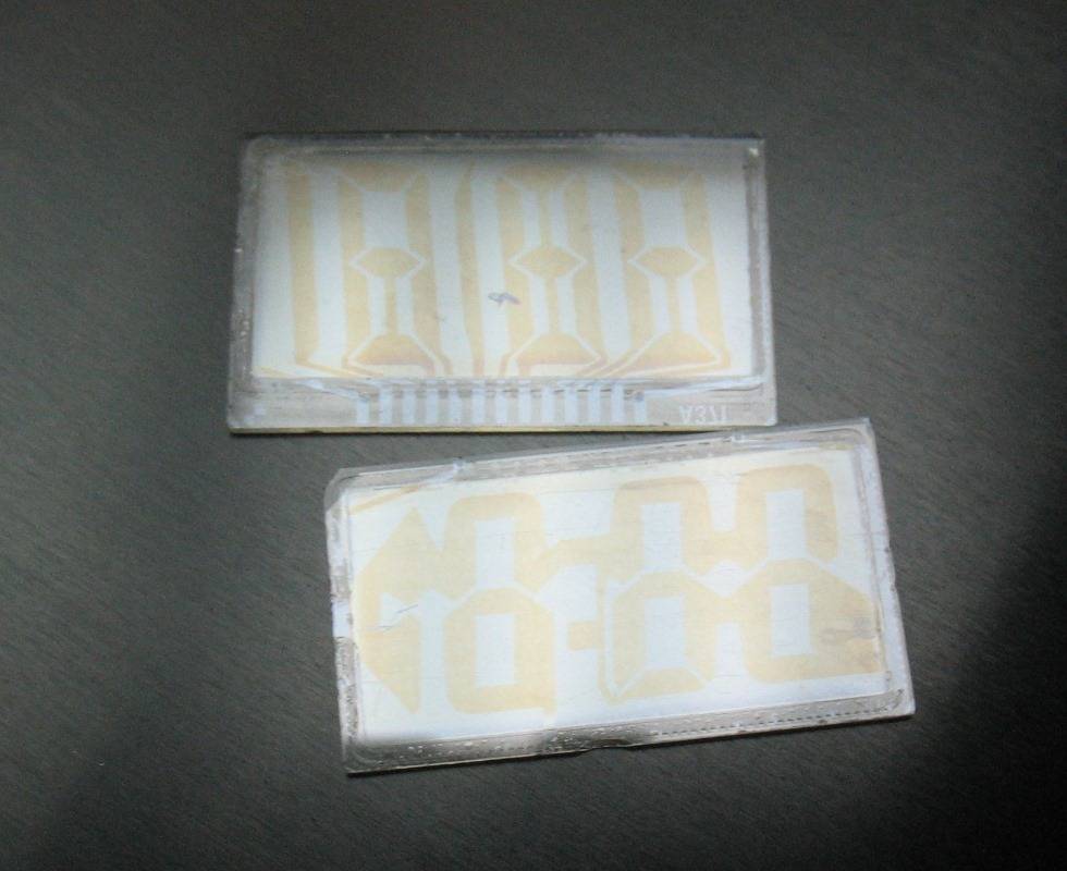 Стекла от ЖК индикатора электронных часов. Индикатор подключался к электронной схеме через токопроводящую резинку, гребенка контактов видна в нижней части стекла.