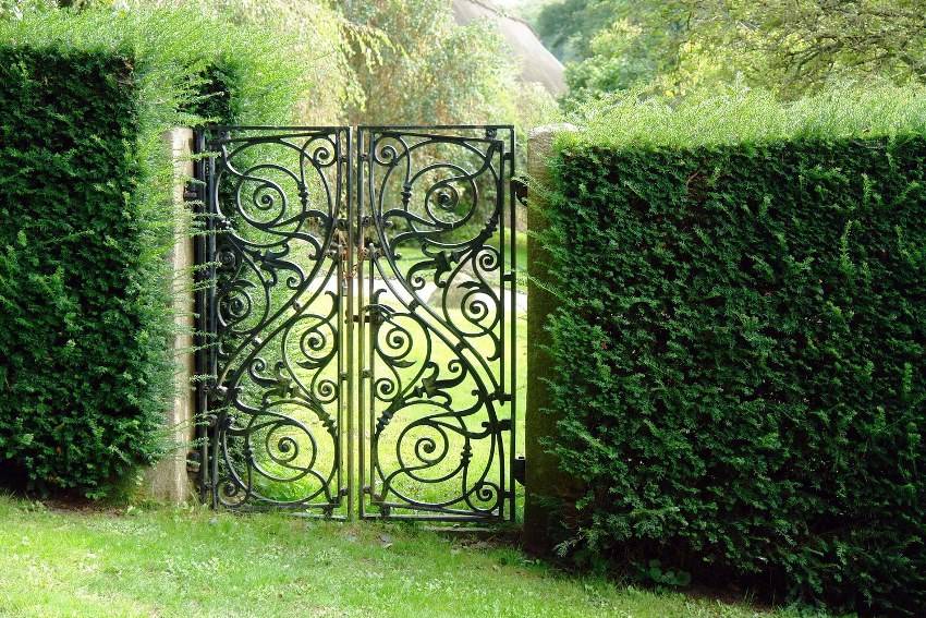 - Живая изгородь в сочетании с коваными воротами придаёт загадочность и оригинальность входной группе участка, особенно если эта изгородь формованная. Но и простое переплетение вьюнов также может придать участку неповторимый вид сказочной усадьбы.