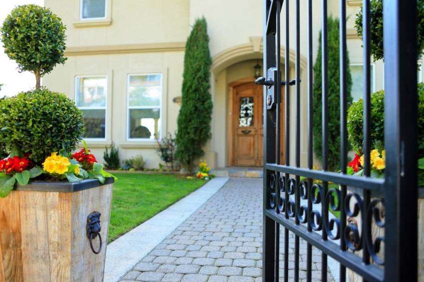 Сквозь открытый тип кованой калитки можно видеть, что находится на участке