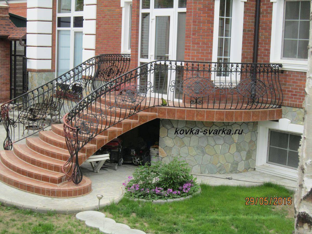 Кованая конструкция – это классика. Они гармонируют с любым экстерьером. Процесс ковки хорошо закаляет материал, поэтому он стае очень прочным. Такие перила подойдут к бетонному, кирпичному, деревянному и каменному крыльцу. Вы можете купить уже готовые УП или, создав свой эскиз, заказать перила кузнецу. Конечно, кованые изделия – удовольствие достаточно дорогое.