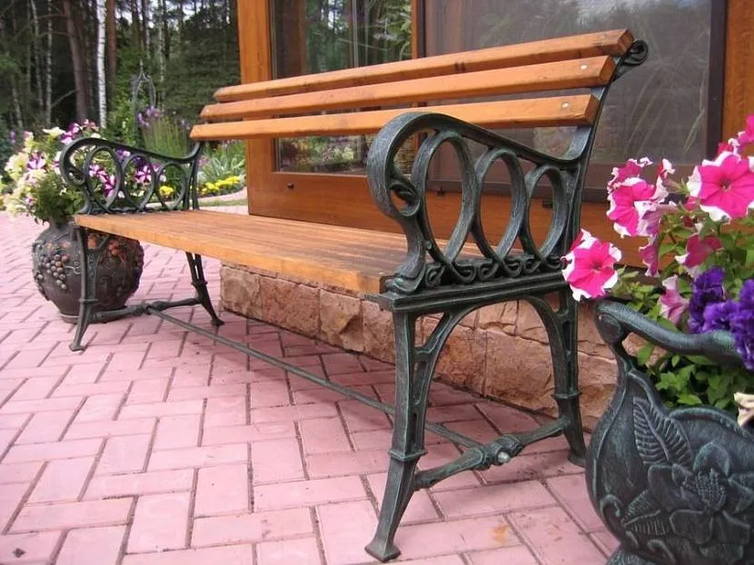 С элементами ковки. Витые подлокотники и причудливые ножки придадут скамейке элегантный вид. Такая конструкция впишется в классический стиль.