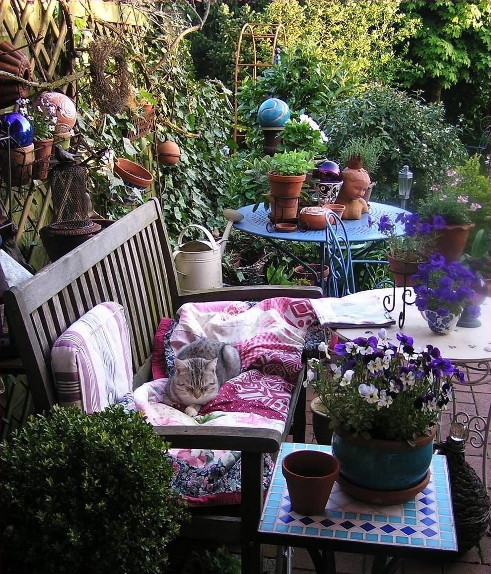Для оформления пространства вокруг водоемов или на открытых солнечных участках можно установить кованые скамейки с каменными или металлическими сиденьями и украсить их пледами, покрывалами, выполненными в стиле макраме или пэчворк , декоративными подушками.
