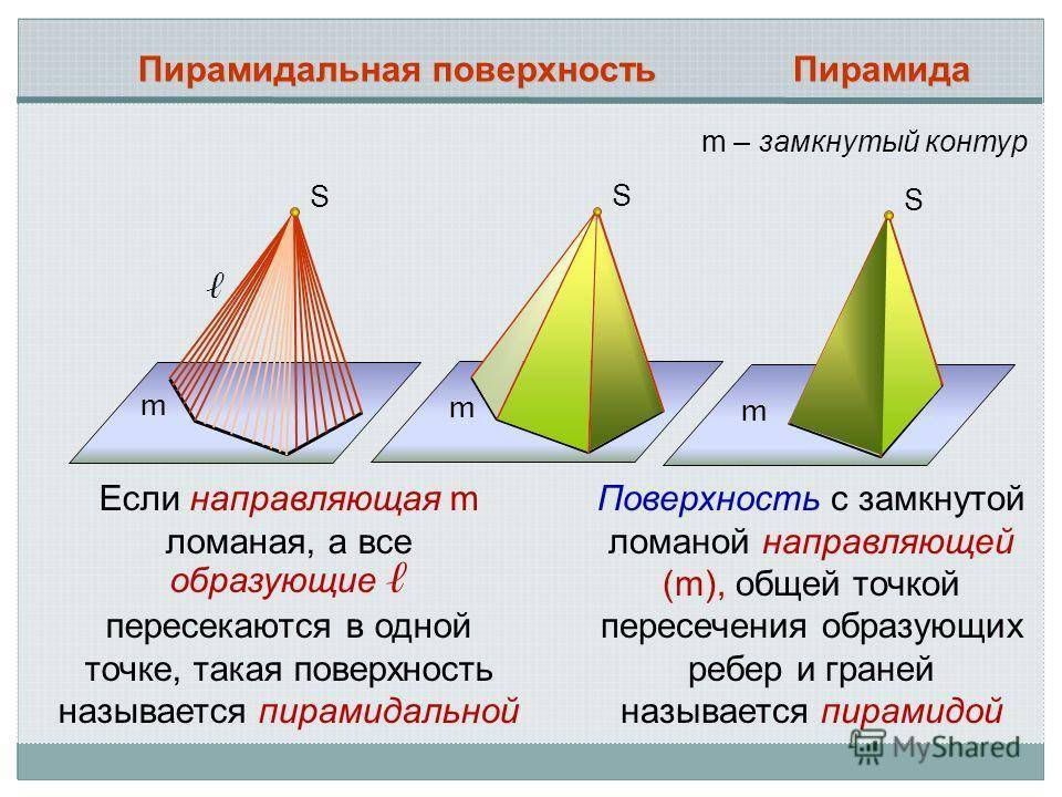 S m S m Пирамидальная поверхность S m Пирамида m – замкнутый контур Если направляющая m ломаная, а все образующие пересекаются в одной точке, такая поверхность называется пирамидальной Поверхность с замкнутой ломаной направляющей (m), общей точкой пересечения образующих ребер и граней называется пирамидой