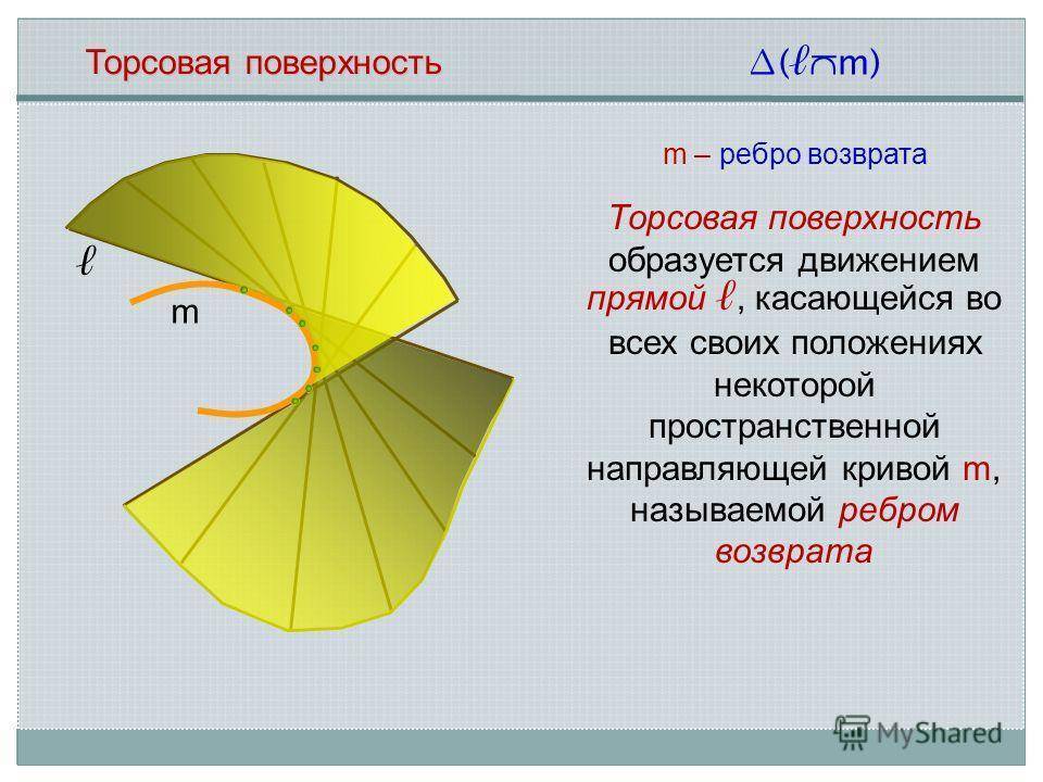 Торсовая поверхность m m – ребро возврата ( m) Торсовая поверхность образуется движением прямой, касающейся во всех своих положениях некоторой пространственной направляющей кривой m, называемой ребром возврата