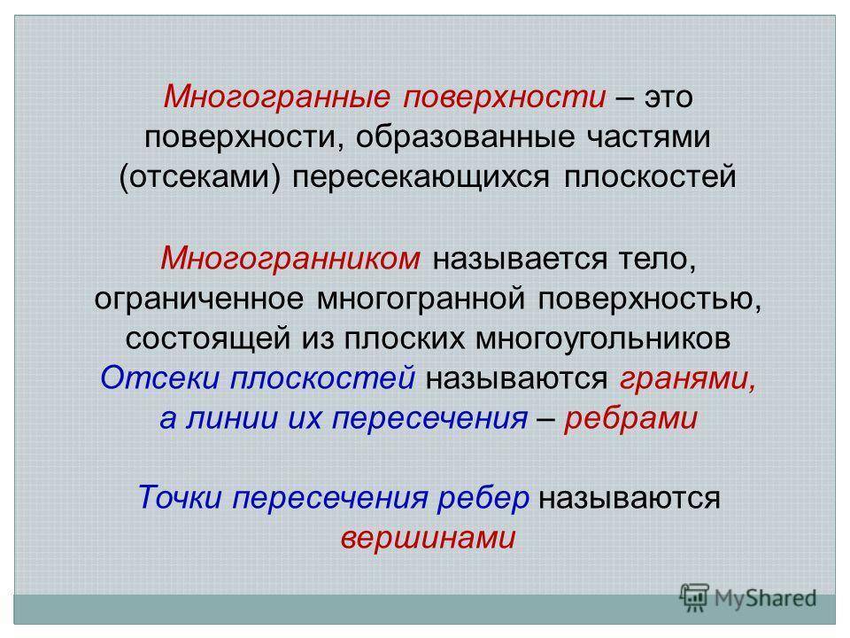 Многогранные поверхности – это поверхности, образованные частями (отсеками) пересекающихся плоскостей Многогранником называется тело, ограниченное многогранной поверхностью, состоящей из плоских многоугольников Отсеки плоскостей называются гранями, а линии их пересечения – ребрами Точки пересечения ребер называются вершинами