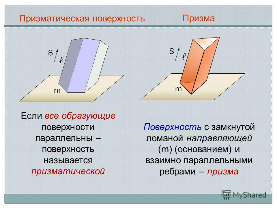 m S Призматическая поверхность m S Призма Если все образующие поверхности параллельны – поверхность называется призматической Поверхность с замкнутой ломаной направляющей (m) (основанием) и взаимно параллельными ребрами – призма
