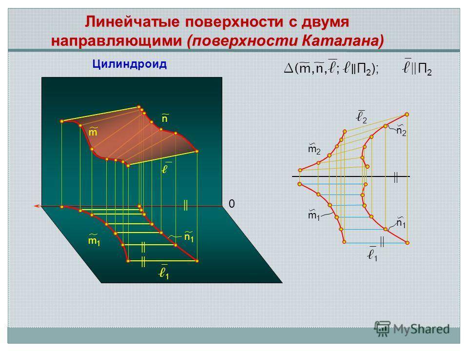 0 m1m1 n1n1 1 1 n m n1n1 m1m1 2 m2m2 n2n2 Линейчатые поверхности с двумя направляющими (поверхности Каталана) П 2 (m,n,; П 2 ); Цилиндроид