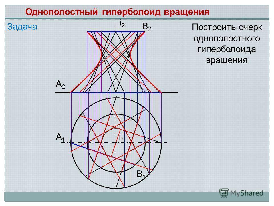 Задача А2А2 А1А1 В1В1 В2В2 i2i2 i1i1 Построить очерк однополостного гиперболоида вращения Однополостный гиперболоид вращения