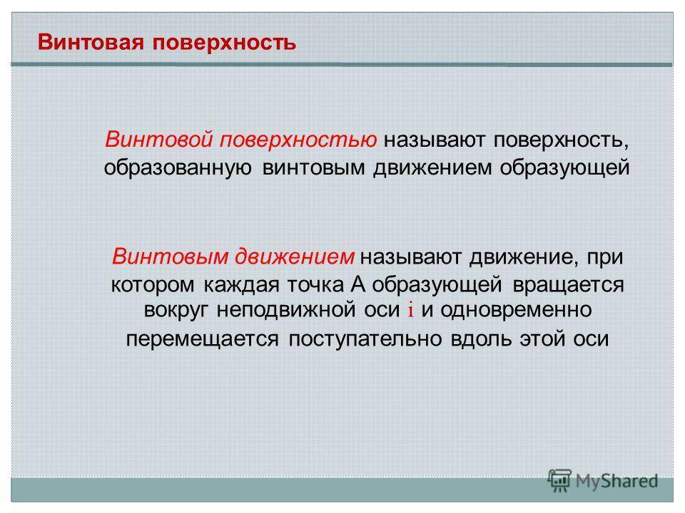 Винтовой поверхностью называют поверхность, образованную винтовым движением образующей Винтовым движением называют движение, при котором каждая точка А образующей вращается вокруг неподвижной оси i и одновременно перемещается поступательно вдоль этой оси Винтовая поверхность