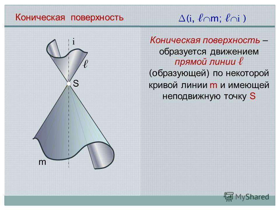 i m ( i, m; i ) Коническая поверхность Коническая поверхность – образуется движением прямой линии (о бразующей) по некоторой кривой линии m и имеющей неподвижную точку S S