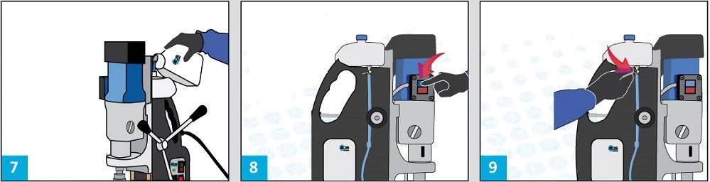 - Заполните бачок для охлаждающей жидкости. Ни в коем случае нельзя сверлить магнитным станком без смазки. Для фрез из быстрорежущей стали отлично подойдут составы на масляной основе. Для кольцевых сверл с твердосплавными напайками — водные охлаждающие жидкости.