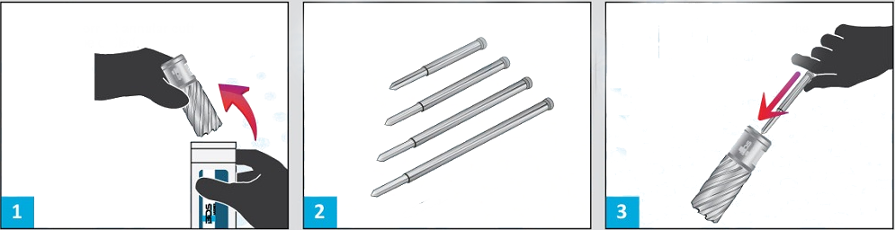 - Установите штифт внутрь фрезы. Помните, использование кольцевых сверл без выталкивателя недопустимо.