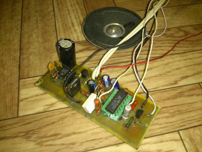 ». Я только добавил выключатель между батареей и микросхемой, а так же я использую электромеханический звукоизлучатель из старого электронного будильника вместо динамика.