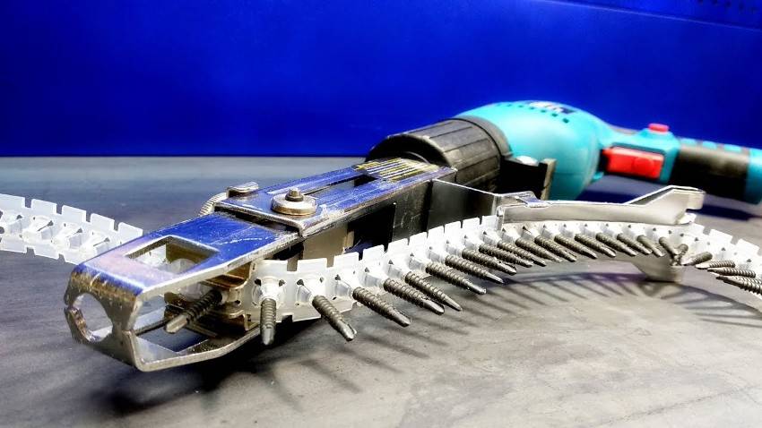 - Далее нужно установить на инструмент «магазин». Сделать это нужно так, чтобы возле дула располагался не саморез, а выступ ленты. Подача крепежа осуществляется в автоматическом режиме, который активируется после нажатия пусковой кнопки.
