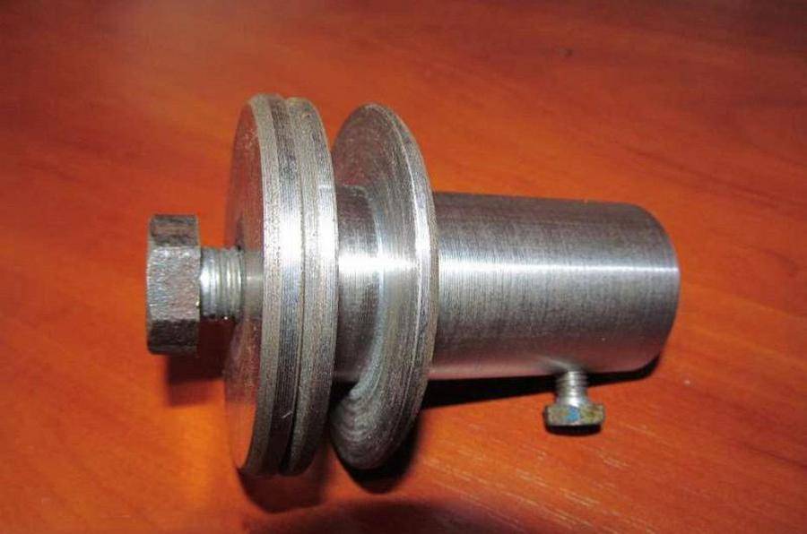 Это единственная деталь, которую нельзя сделать своими руками. Потребуется токарный станок и, соответственно, человек, умеющий на нем работать. Для чего нужен переходник? Дело в том, что размер вала двигателя около 14мм, при этом посадочное отверстие