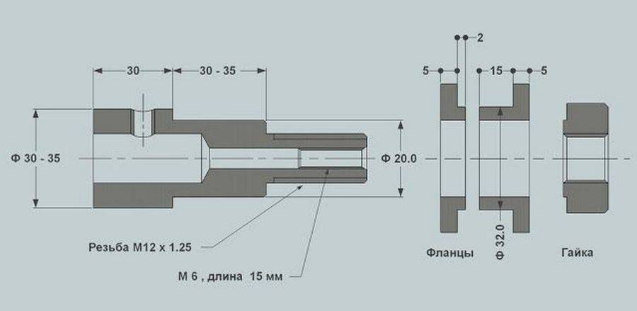 С одной стороны переходник имеет отверстие для насадки на вал, с другой — фланец с резьбой для установки заточного круга. Изготавливается он с помощью токарного станка. Заранее подготавливается чертеж с обозначениями размеров вала и диаметра внутренней части шлифовального камня.