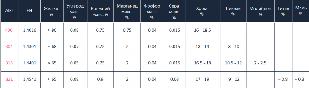 Выделяется несколько видов нержавейки, которые отличаются составом, свойствами.