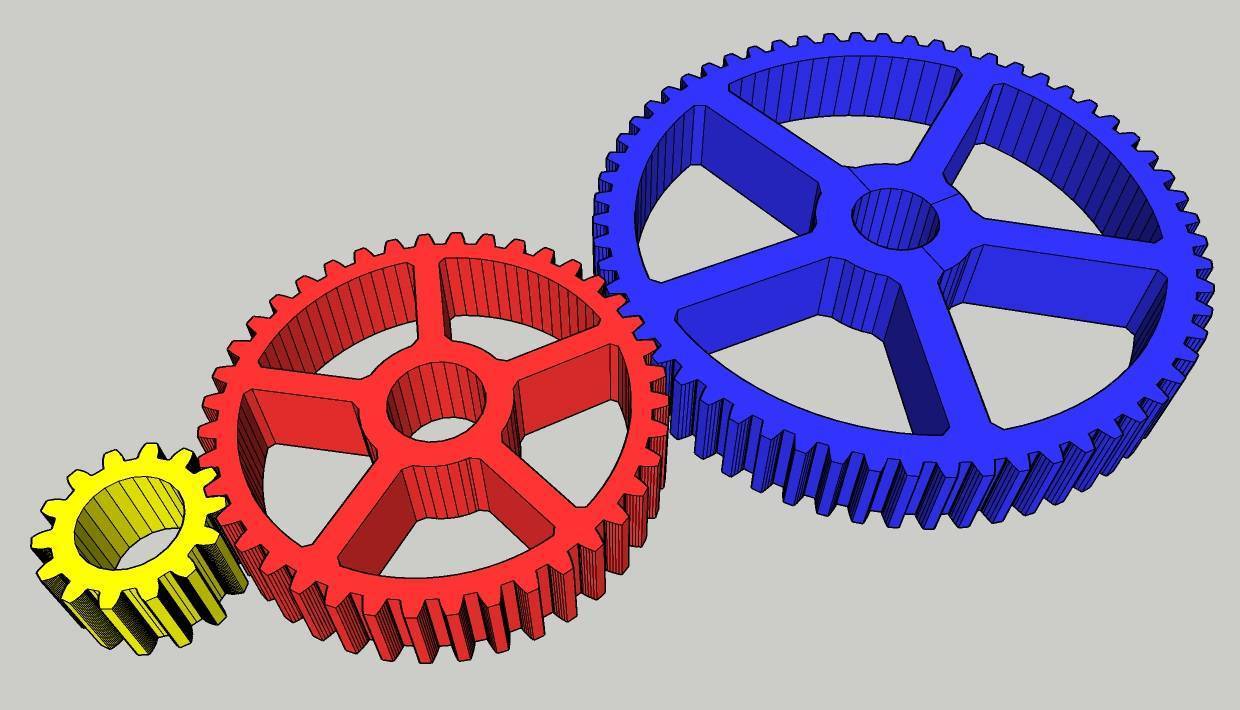 Такое передаточное отношение означает, что красная, ведущая шестерня должна совершить полтора оборота, чтобы синяя, ведомая шестерня совершила один оборот.