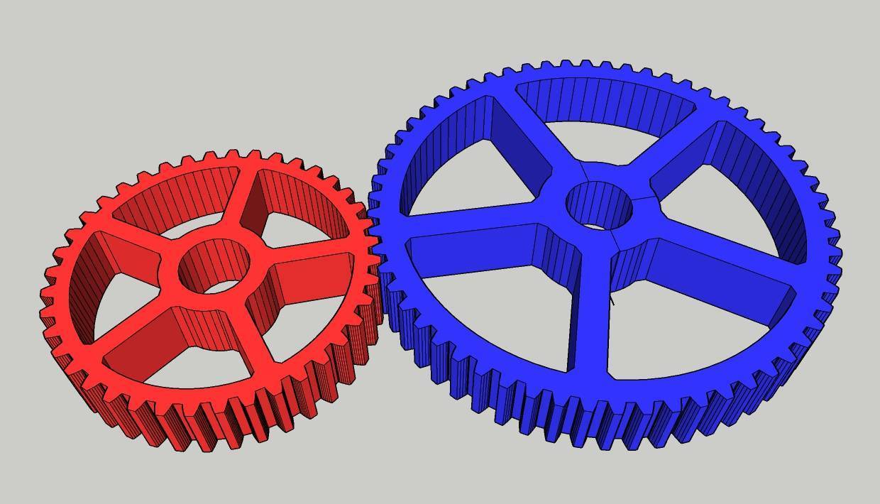 Представим, что ведущая шестерня (красная) имеет 40 зубьев, а ведомая(синяя) имеет 60 зубьев.