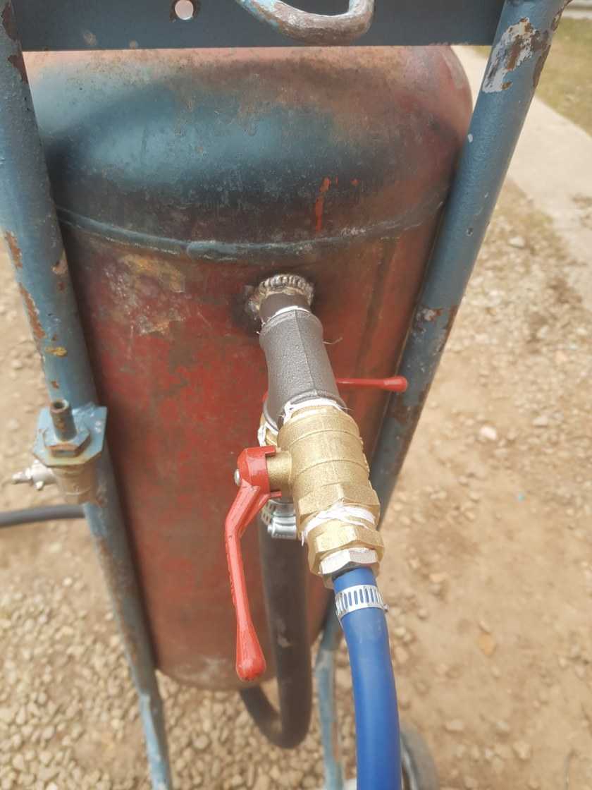 После этого в отверстие наверху газового баллона устанавливают тройник с шаровой запирающей системой на отводе. На днище пескоструйного аппарата закрепляют еще один кран с муфтой на 50 мм.
