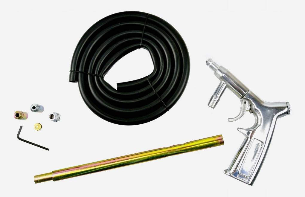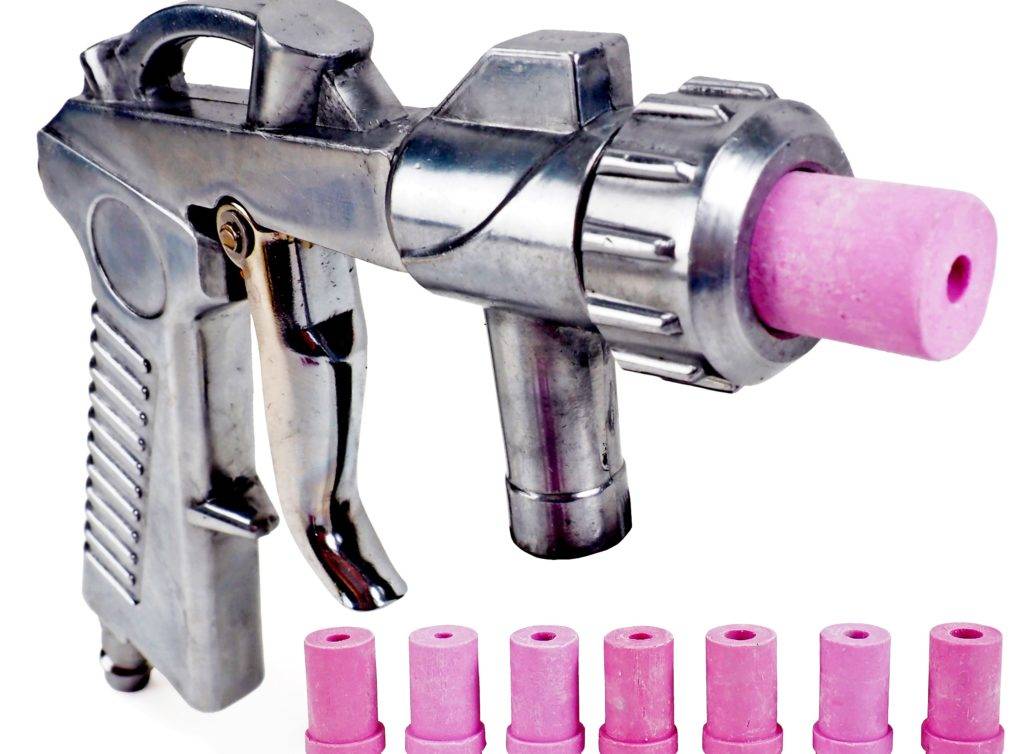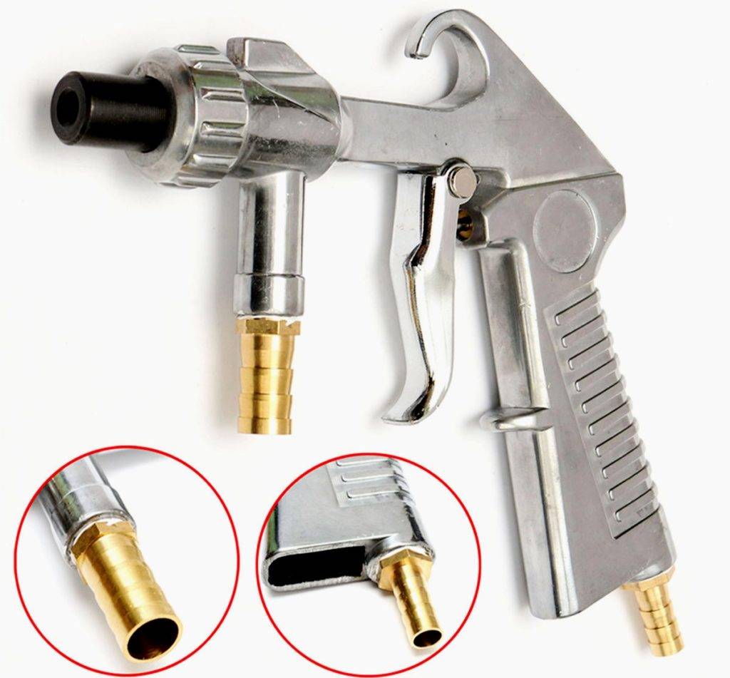 Пескоструйный пистолет — это сопло, которое крепится к пневматическому оборудованию. Последние могут быть переносными или стационарными. Через трубку проходят абразивные вещества, которые наносятся на поверхность, при этом пользователь может самостоятельно регулировать скорость подачи