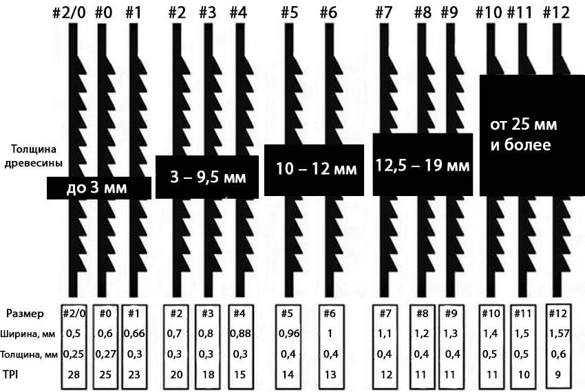 Форма зубьев зависит от толщины полотна. Классифицируются от 0 (для выпиливания тонкой заготовки) до 12 (пропил материала толщиной 15-20 мм).