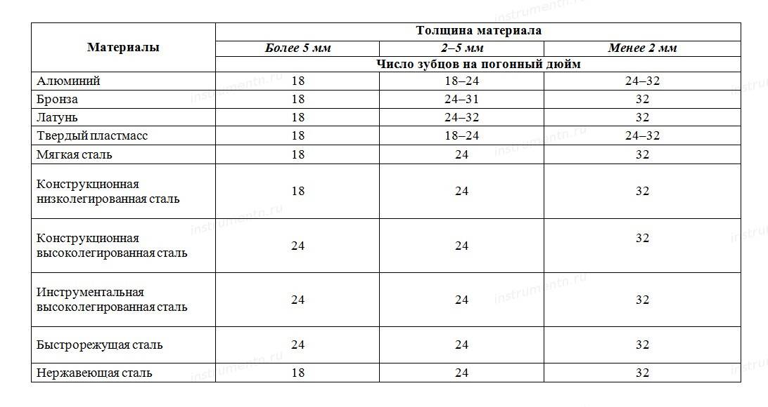 Для обработки материалов разной твердости рекомендуется использовать пилки с определенным числом зубцов.