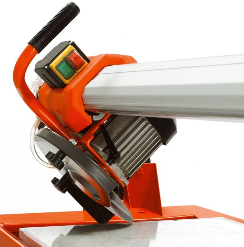 Производительный плиткорез считается профессионального типа. Под прямым углом на станке можно сделать пропил глубиной до 52 мм. Мощность двигателя 1,2 кВт. Частота вращения шпинделя достигает 2950 об/мин. Плиткорез работает с алмазными кругами диаметром до 250 мм. В зависимости от назначения диски ставят меньшего размера, но с внутренним посадочным гнездом диаметром 25 мм. Минусом считается большой вес электрического станка – 64 кг.