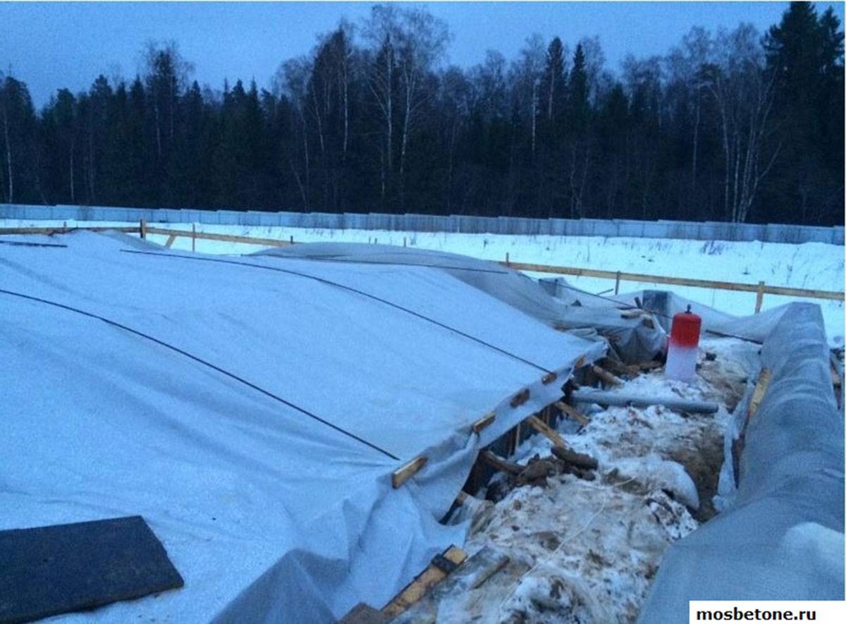 - бетонную смесь после укладки и уплотнения укрывают полимерной пленкой, а также теплоизолирующими материалами, что позволяет сохранить тепло, выделяющееся в процессе гидратации цемента;
