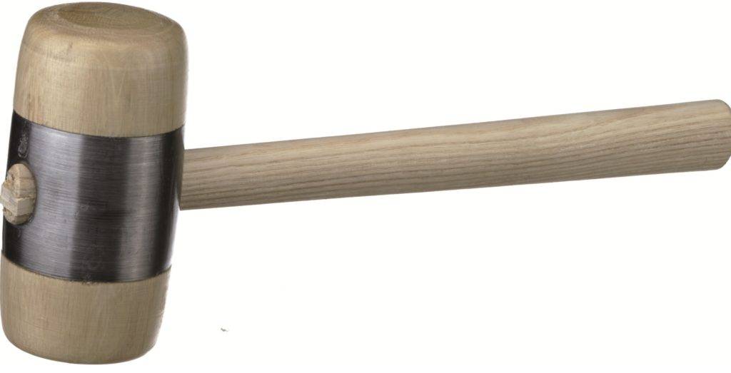 Деревянный инструмент используют для кровельных и жестяных работ. Он выполнен из прочных сортов древесины (бук, граб). Металлический бондаж усиливает прочность головки. Длинна рукоятки составляет 250 мм.