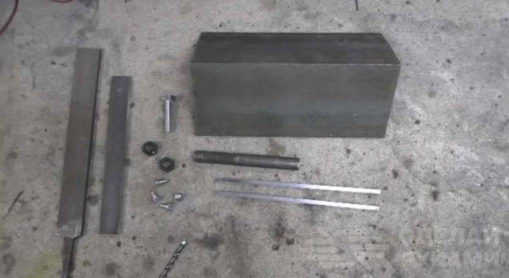 Для изготовления данного приспособления потребуется 2 старых напильника по металлу, болт М10 с двумя гайками, отрезок уголка 100х100 мм (из него мастер будет делать корпус станины).