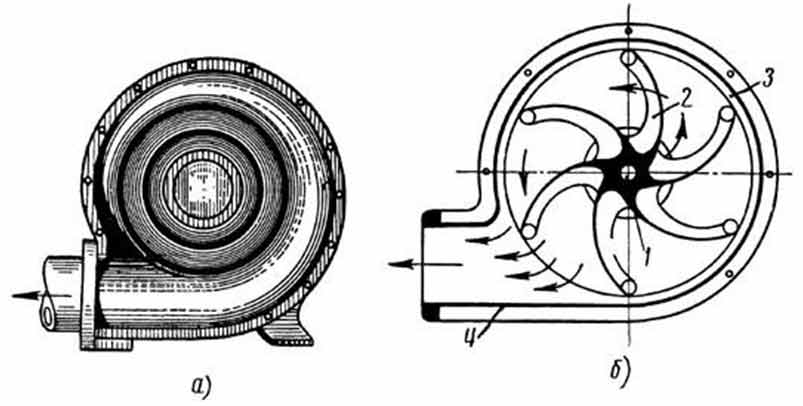 Вентилятор для кузнечного горна такого типа часто имеет корпус, который выполнен в форме улитки. Его внутреннее устройство и принцип работы изображены на рисунке, где а) — это внешний вид, б) — устройство и расположение внутренних деталей.