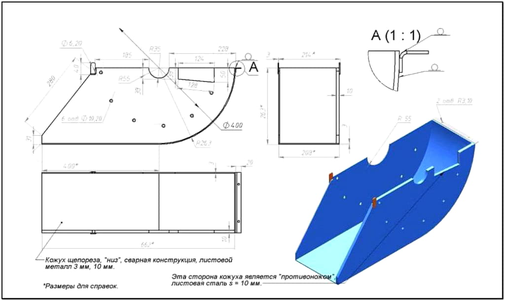 При составлении чертежа станка для арболита и изготовлении кожуха важно выдерживать все размеры, чтобы режущий узел свободно помещался в корпусе и не цеплял стенки. Для этого диаметр изделия должен быть на 30-50 мм больше маховика